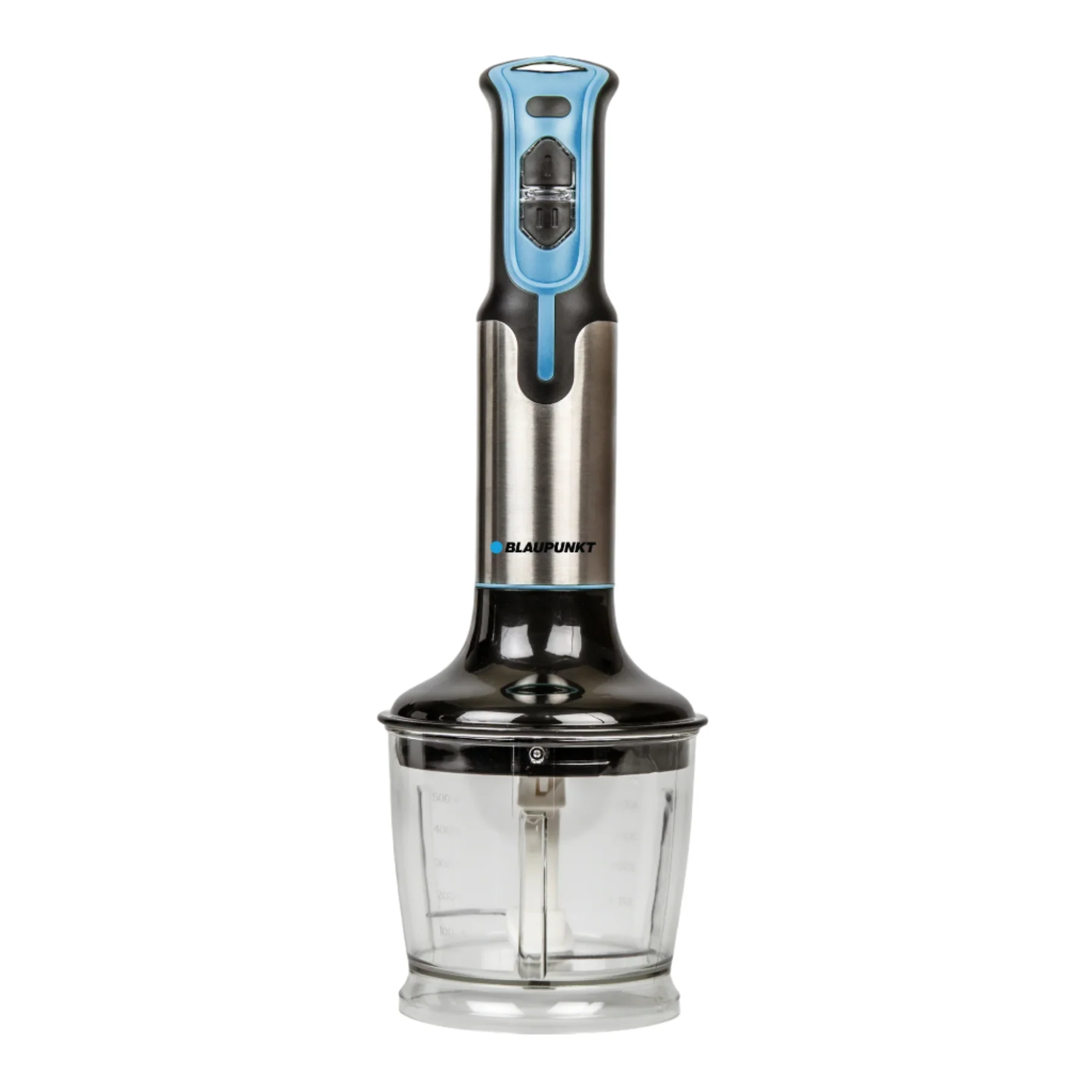 Immersion hand blender with blue and black handle and a clear attached chopper jar (Blaupunkt brand).
