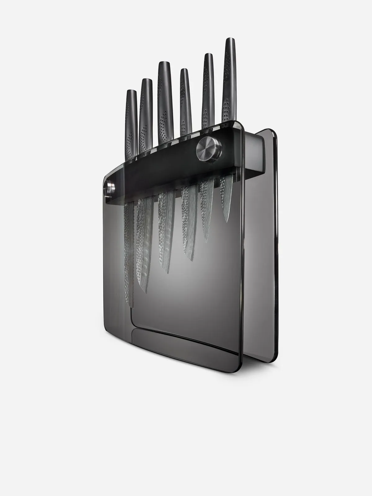 The Cuisine::pro iD3 Black Samurai Sakai Knife Block includes 6 knives in a stylish knife block with transparent sides to showcase your blades.