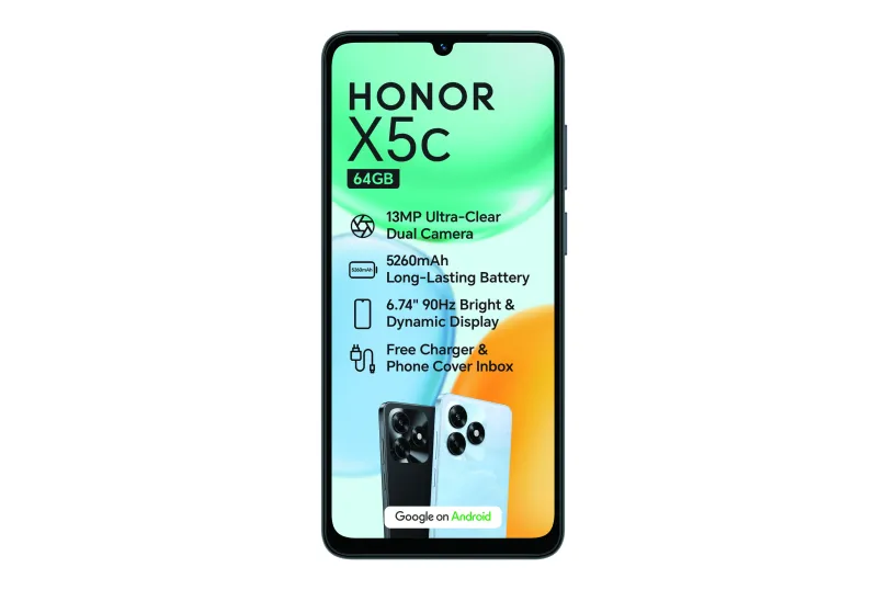 • HONOR X5c smartphone, 64GB, featuring 13MP dual camera, 5260mAh battery, 6.74-inch 90Hz display, charger and phone cover included. Honor X5C 4G Dual Sim 64GB R1,699.00 Original price was: R1,699.00.R1,599.00Current price is: R1,599.00.