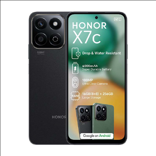 The HONOR X7c is a budget-friendly 4G smartphone (released Oct 2024) featuring a large 6000mAh battery, 108MP main camera, and 6.77-inch 120Hz display. It runs on a Snapdragon 685 processor, with up to 16GB (8+8) RAM and 256GB storage. It emphasizes durability with SGS-certified drop resistance and IP64 water/dust resistance.
